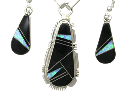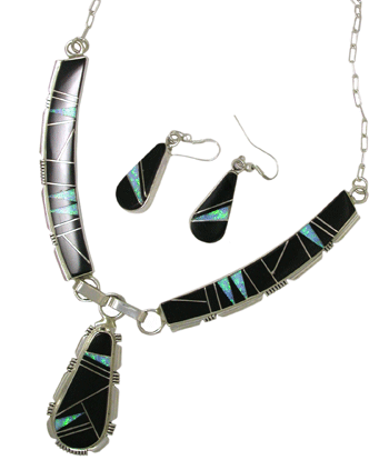 Santa Fe Craftsman carries all genres of Native American jewelry, but enjoys bringing the more contemporary to light. Some of my very favorites include necklaces and bracelets with stone and inlay work. It is amazing to see the detail and talent on display through each individual piece. I really like the contrast of black onyx stones with the sterling silver, such as this necklace and earring set. A stunning inlay of opal and black onyx makes quite the statement and makes you feel gorgeous wearing it.