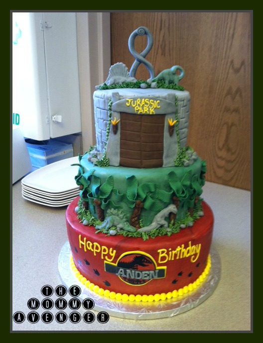 For my son’s actual birthday, he wanted a Jurassic Park cake (he loves all things to do with Jurassic Park!) While not a traditional baptism cake, it certainly fit his personality to a “T” and was enjoyed by all our guests, but my birthday boy especially loved digging in to this vanilla cake with raspberry filling.