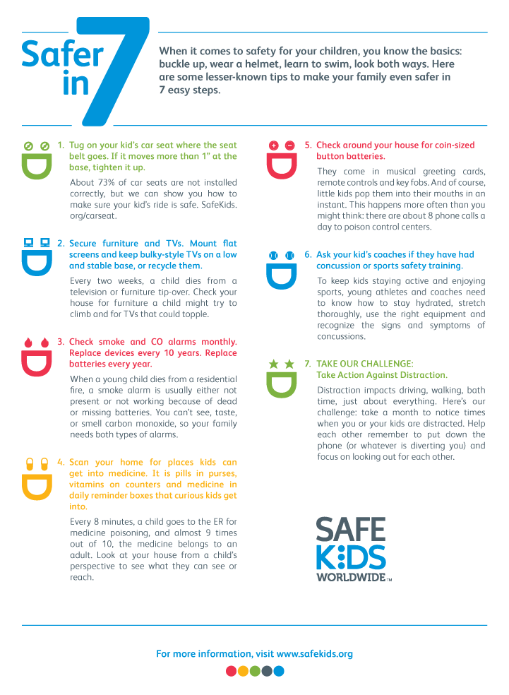 Safe Kids has some great tips for families to implement in their lives. Take some time to go over these safety guidelines and take the steps necessary to prevent unnecessary accidents in children.