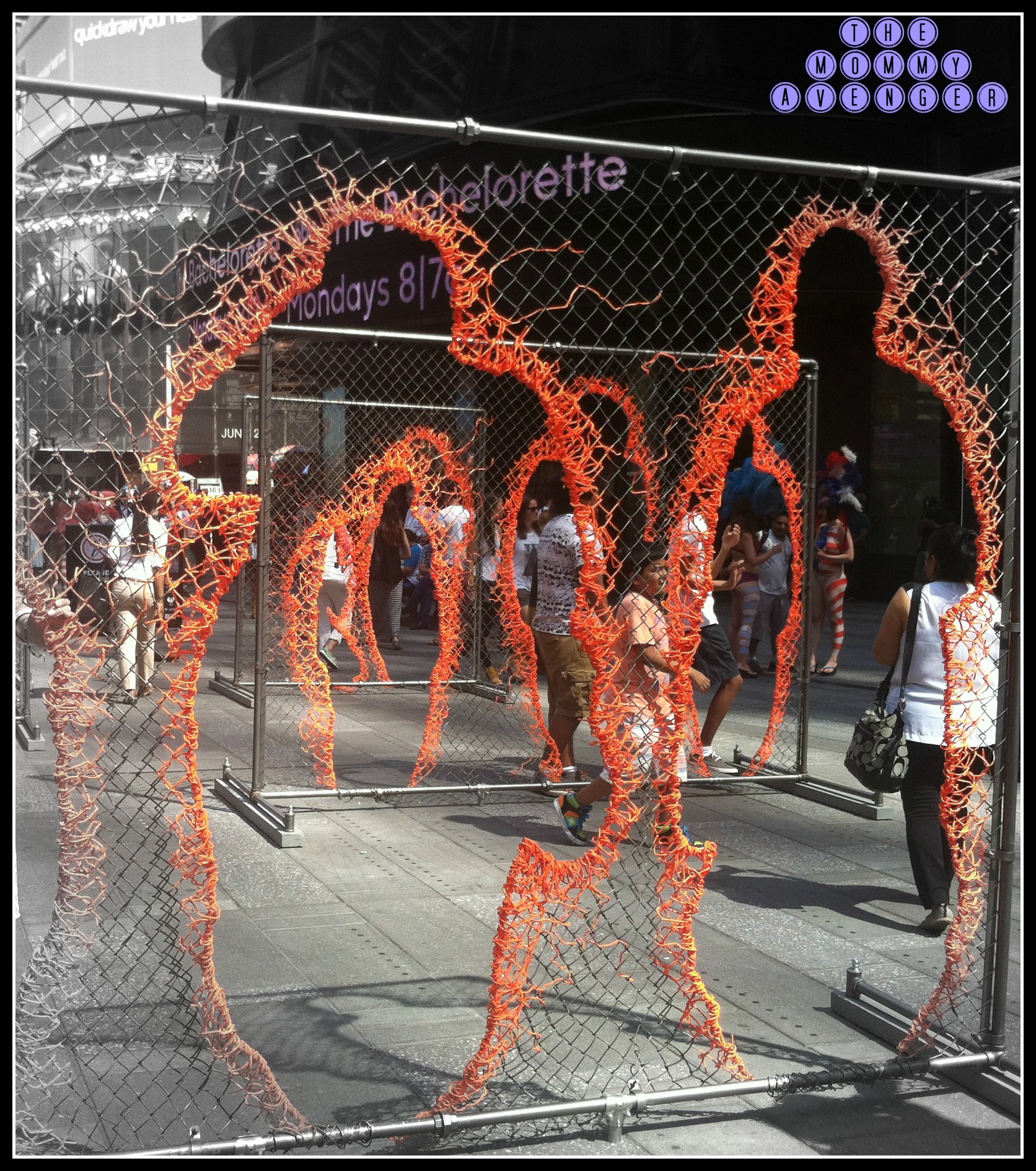 You never know what you will find in Times Square on any given day. Costumed characters, naked cowboys, women with nothing but body paint on…you just never know. One thing you can always count on is for there to be something going on. Last week, we happened upon an art installation called Nearness. This is a collection of chain link fences with body cutouts of every shape and size outlined in a blazing orange color.