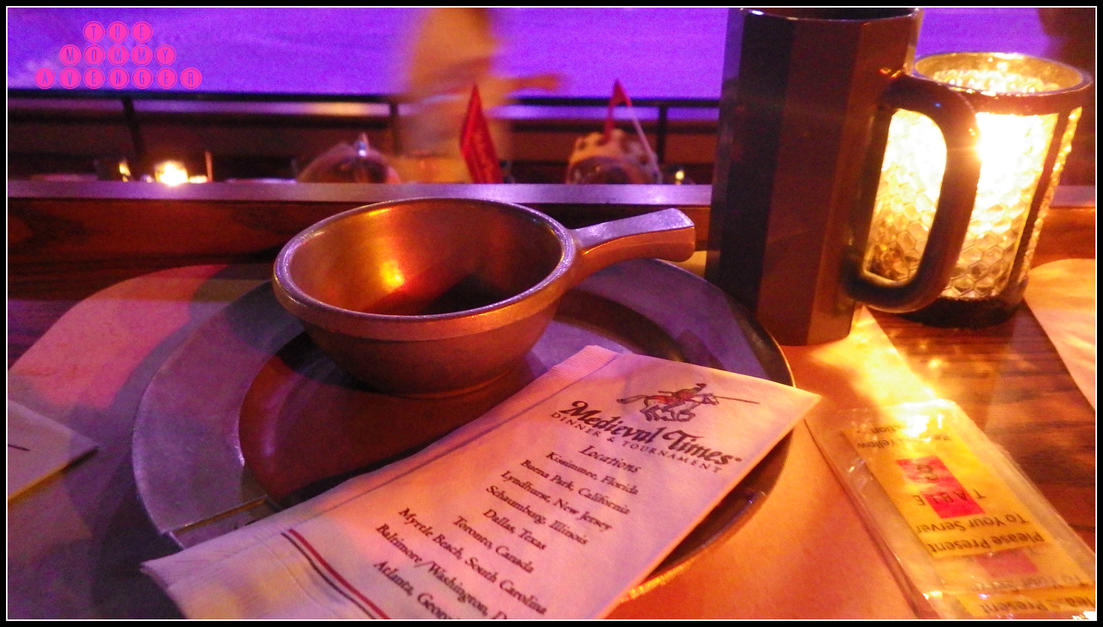 Once we were shown our seats, our servers immediately came by and began serving our meal in their respective courses. I really had no idea what to expect from the meal. I, for one, am not crazy about eating with my hands, but as my kids pointed out, that just added to the fun and spirit of the show. This meal is completely utensil free! In the end, it really did add to the fun. The meal consisted of a really yummy tomato bisque soup with garlic bread, 1/2 chicken, barbeque rib, and an herbed baked potato. For dessert, a hot apple turnover. The food was delicious! The chicken was so tender, it just fell off the bone! I thought the food would be a little iffy for my boys, but they absolutely loved it!