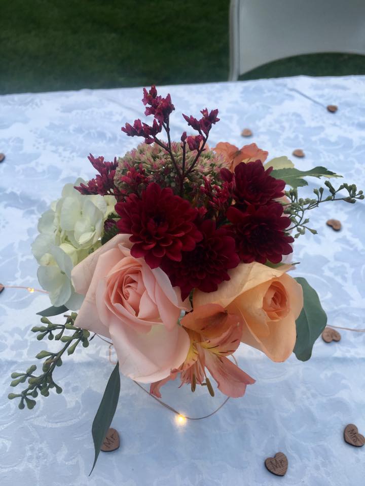 Having to do an evening reception, I was worried about the lighting. Our deck can get pretty dark, so we wanted to find a creative and inexpensive way to lend some light. After some Pinterest inspiration, my friend created this awesome solution. A hula hoop wrapped in ribbon and icicle lights made for a very unique chandelier. It was an amazing solution that illuminated the whole deck and created a very cool ambiance.