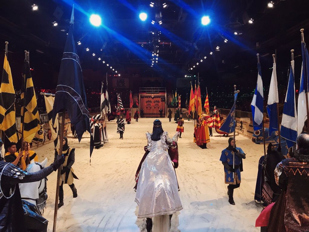 We were able to reserve a Saturday afternoon show, and you can arrive 75 minutes before the show starts to tour the castle. We walked in the door and were greeted by guards, escorted to where you get your tickets, and each of us received our table number and a crown, with a corresponding color to the knight which we are to root for during the show. We were given the red and yellow knight. Once your crown color has been announced, you are allowed into the castle. Until that point, you can go inside to wait. There are a few bars and tables to sit and relax, as well as many souvenir shops. You can buy anything your little guys could ever want related to the time period–costumes, swords, flags, banners, dragons and all sorts of knick knacks. There are walls of swords on display, which was fun to look at. We were able to witness a few knighting ceremonies with the Queen. There were also booths to do face painting. The atmosphere is really exciting and fun.