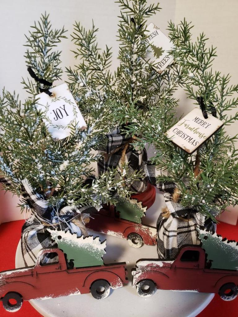 I love these super cute buffalo plaid Christmas trees from Irishandmadedecor, a fun shop found on etsy. These farmhouse mini table top trees add such an adorable festive feel to shelving or tables. I love the idea of gifting these to friends and neighbors for the holidays! Iris, the shop owner, is wonderful to work with and has a wide variety of other farmhouse themed Christmas items on her shop. Be sure to check out her shop–you’ll love it!