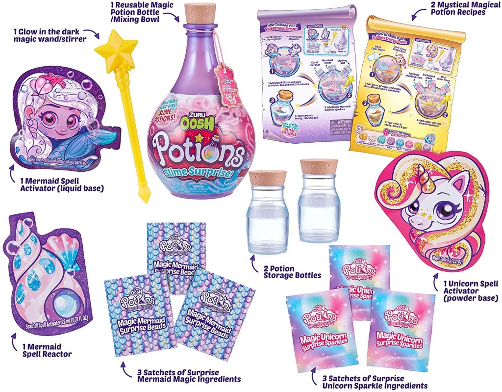 Oh my gosh! How fun is this?! Four different Zuru Oosh Potions Slime Surprises! So exciting to see what this was all about! Open up the potion bottles and inside you have everything you need to create your own incredible slime. Really, unbeknownst to the recipient, it’s like a sparkle-covered science project. We think learning disguised as fun is always the best! Check out what’s inside: