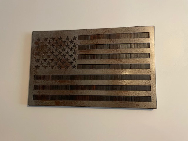 Each piece is one of a kind. Handmade and sturdy, these pieces are laser cut steel finished with a beautiful patina and backed with reclaimed wood. The finish is somewhat industrial, which is a look I really love. The art is masculine and has very clean lines. It is created so well, they are pieces that are absolutely beautiful to display. I can’t say enough about the quality of the Longhorn Steer and Old Glory art we have the pleasure of seeing each day.