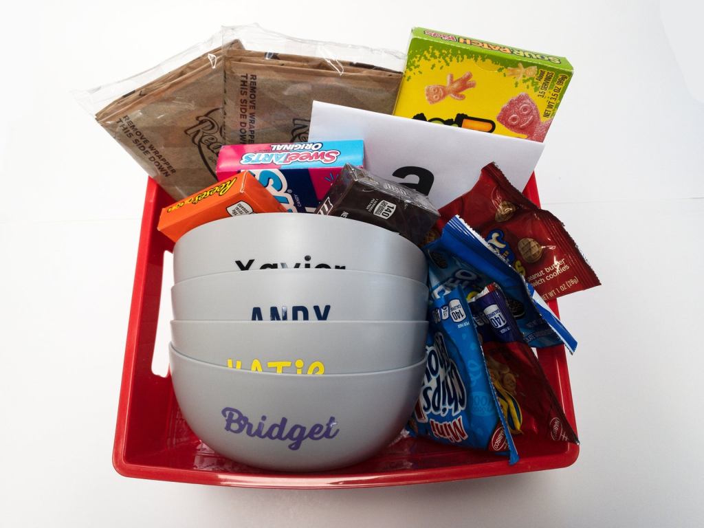 Now that you have this hot delicious popcorn ready to go, you’re going to need something to put it in! We could pick cups or ordinary bowls, but since we are all about making things special in a time where there has been a lot of disappointment and uncertainty, I am really excited to share with you this super fun shop I found on Etsy that makes the perfect movie night kits just for you. BlueFoxGiftBox has the greatest gifts! Each kit is overflowing with sweet movie theater-style treat boxes, cookies, and popcorn and –the best part– four personalized popcorn bowls. The grey bowls are the perfect weight and easy to wash and are customized for your family. You can select a font and color to put names on the bowl. Although it comes with four, you can also order extra ones, if needed. I absolutely adore how these turned out. Each member of my family picked out how they wanted their bowls customized and they were very happy with the results! You will want to pick up some for your own family, but you will love them so much, you may want to give a gift box to friends and loved ones, too! That’s ok, because now you have great ideas for upcoming birthdays and holidays! See? I just helped you figure out what to get those hard to buy for people for Christmas and it’s only March! You’re welcome 🙂 You can order them now to get ahead of the game or check out her shop for special date night ideas, ice cream kits, and more. I highly recommend checking out her store!