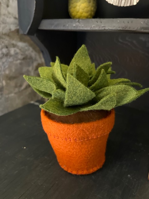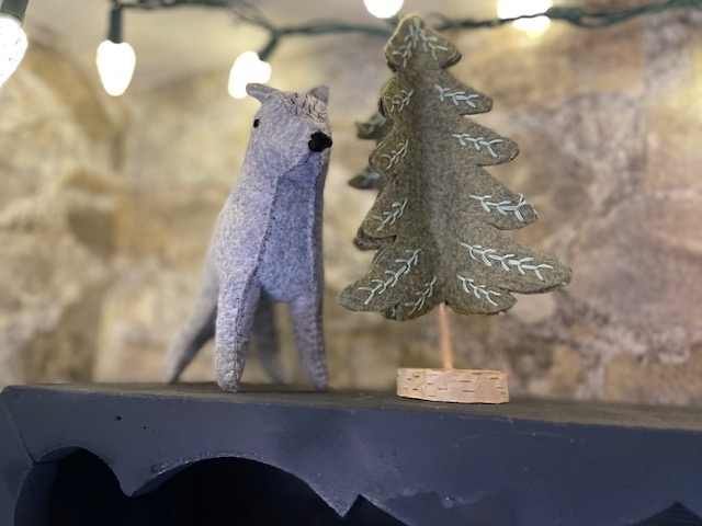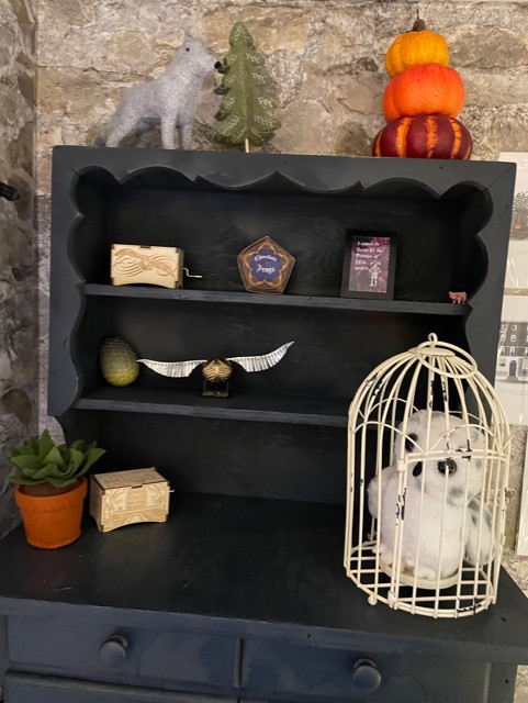 Now it was time to accessorize the space! I wanted to find things that might have been in Hagrid’s Hut or things you would have found in the castle, all the while being something safe to keep within the reach of little hands. I picked up a birdcage to place a stuffed Hedwig and plastic pumpkins at Hobby Lobby. I found the most adorable Etsy shop that makes felt critters, food, and decor, WhyKnotsCollections. This is the sweetest shop and I found the perfect accessories for our little cupboard here. A soft felt succulent is something I can’t get over. I love the idea of having little plants in here without the worry of something breaking or being ingested by little ones. They also created a wolf and tree, which fits the decor perfectly!