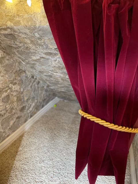 I wanted to divide the area into sections. I wanted some spots to resemble Kings Cross Station and Platform 9 3/4, some areas to look like Hogwarts, and one section to look like a living space is Gryffindor common area. I knew I would be putting a bunch of toys in here for my nieces and nephews to play with, but I didn’t want it to look over run with clutter, which would be easy to do in such a small space. So, I looked to Lushes Curtains for a simple and unique solution. This online retailer was amazing to work with! They created a custom burgundy flocked velvet curtain with gold rope tie backs for one of the walls. The process couldn’t have been easier for me. There is no way I could have found a more perfect solution for toy storage. I simply measured the area and explained what I wanted to do. They helped me come up with just the right size curtain for the space. I added a simple curtain rod to the wall and I had these hung up in no time. I love that the red velvet looks like something straight out of a castle. The quality of the curtains is amazing, just the right texture and weight for the space. I can keep the curtain tied back for a neat look, or I can undo it to hide any unsightly mess created by bigger toys. I highly recommend Lushes Curtains for all your curtain needs!