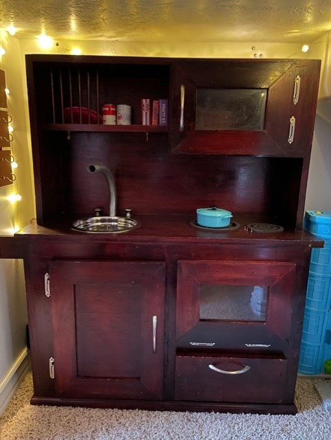 I found some really adorable used furniture for the space through Facebook marketplace. Since this was going to be a Harry Potter themed space and I wanted it to be warmer colors and not bright pink plastic kitchens, I had to scour for a bit. But, what I found seems to be perfect. I found a wooden cupboard that I spray painted dark gray that has little drawers and cupboards that open and close. I also found a wooden kitchen.