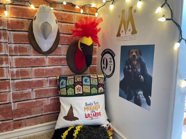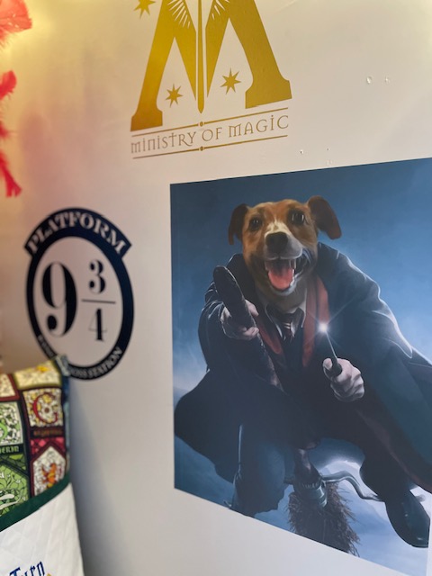 On the other side of the space, we added some more stick and peel wallpaper, this time a red brick print that would be reminiscent of King’s Cross Station. We found some wall decals for Platform 9 3/4 and the Ministry of Magic. To add to the fun, we thought it would be great to add in a familiar face to the wall. That’s right, we put a portrait of our Jack Russell,Olive, dressed as a Gryffindor quidditch player. We were able to design this through Etsy shop YOPETZ. This shop is wonderful! He was able to create just the right portrait of our favorite pooch and it turned out great. We printed it out on peel and stick paper, so it was easy to put on the walls, without taking up a ton of space. Now everytime the kids see her photo, I hear lots of giggling.