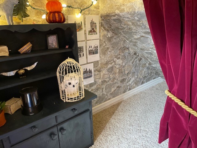 When we moved into our new house this year, I found we had a “cupboard under the stairs” of our own! I knew immediately what I had to do with that space! Although my kids are way older now, I have a large amount of young nieces and nephews and maybe one day in the not-so-distant- future, grandkids of my own, that we could introduce to our very favorite characters and wizard-themed world. So, we decided to create a magical themed play space under the stairs. Here’s what we came up with!