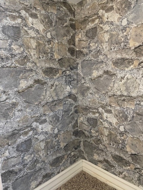 We started off without a plan in mind and it sort of evolved. We knew it was too plain as it was. I’m not big into painting and in a small space like this, that could have been hard to maneuver. We opted for peel and stick wallpaper from Etsy shop D Marie Interiors. I think this was the best thing I could have done for this space. It instantly transformed the feel of the inside and was the perfect building block for creating a new realm. The peel and stick wallpaper was super forgiving of any mistakes I made. It was so easy to apply! If I messed up, I could peel it off and try again. But really, I had this up in no time! The great thing is, if I ever wanted to redo the space or needed to remove the stone wallpaper for any reason, it comes right off and is reusable.