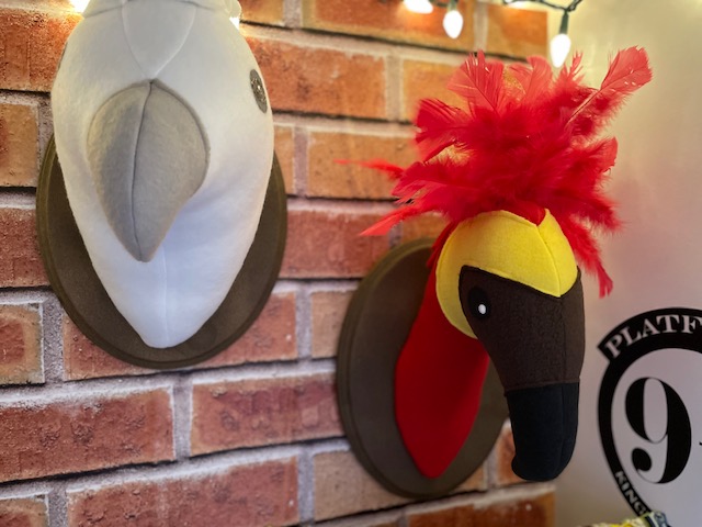 To finish off the decor on the walls, we added some more mystical creatures important to the wizarding world. These are the funniest and definitely the most unique accessories I have found. They work perfectly in this space, but would also be great in a Harry Potter themed nursery. GrammaInTheBox created these amazing faux taxidermy pieces of a phoenix and HippoGriff and they take our decor to an another level. I mean, seriously! How awesome are these stuffed and mounted animals? The quality and detail of these handmade animals is off the charts. Sheri, the talent behind the shop, is very gifted and did a spectacular job making these. I love them, and more importantly, so does everyone who comes into the space.