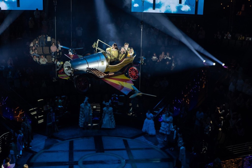 Chitty Chitty Bang Bang was a charming, magical experience to watch. The set design and unique theater in the round provided a one of a kind comedic adventure. The use of fog and lighting created an illusion that was shocking and delightful. The costumes were very colorful and shiny and added a delightful flare to the quirkiness and eccentric plot of the show.