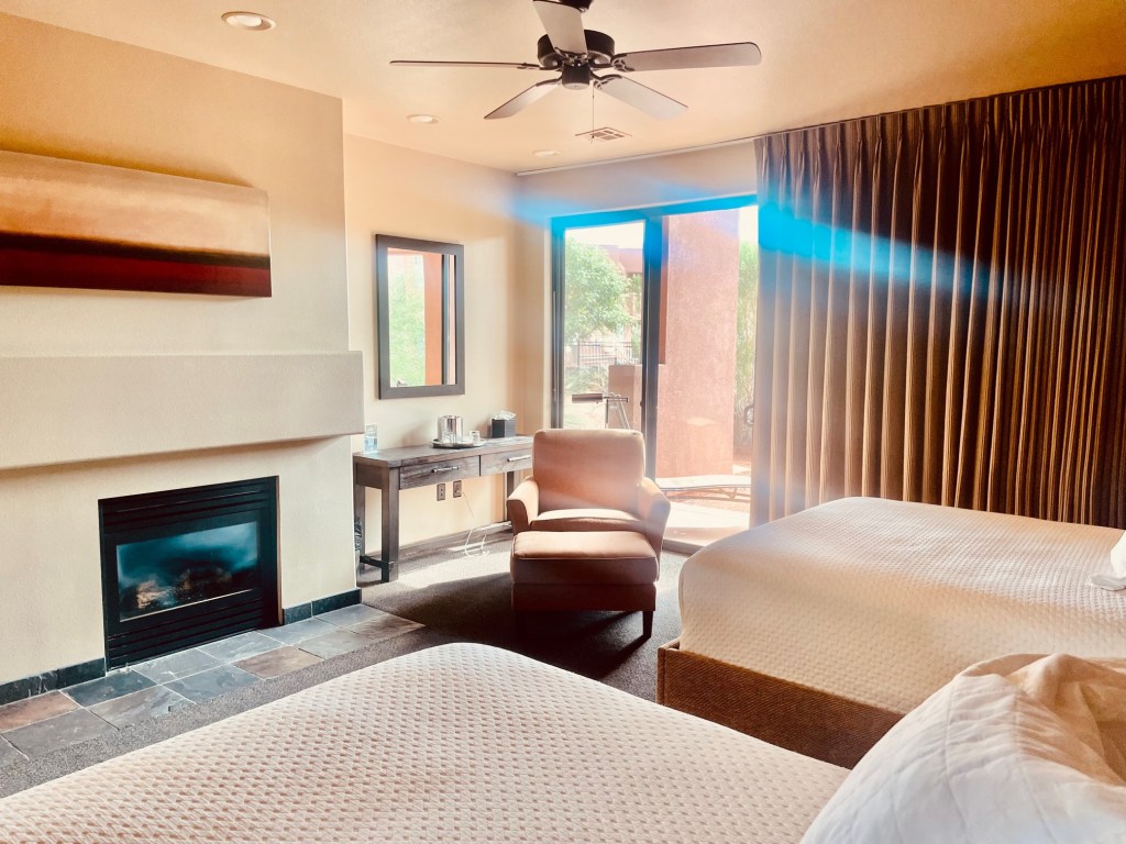 When we got to our room, I was so impressed at how large it was. Walking through the door, there was a long hallway, full sized bathroom with double sink vanity, walk-in shower, jacuzzi tub, with a separate toilet enclosure. It was very spacious and very nicely designed. Closets lined the hallway for storage and led the way into the bedroom portion of the suite. Two queen sized beds with extremely comfortable mattresses, bedding, and both firm and soft pillows would allow for a very restful night’s sleep at the end of lots of activity each day. A desk, nightstand, lounge chair, and nice sized TV and a lovely fireplace also filled the room, allowing for plenty of walking space around. It was a very luxurious bedroom. From the bedroom, we could open a sliding glass patio door to an outdoor area where we could enjoy the fresh air and lovely summer evenings. If that had been everything in the suite, I would have been more than happy. However, there was so much more to be seen still!