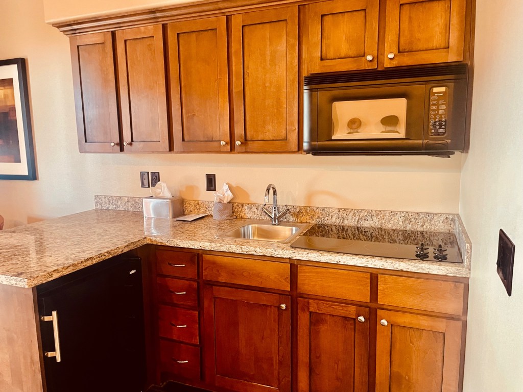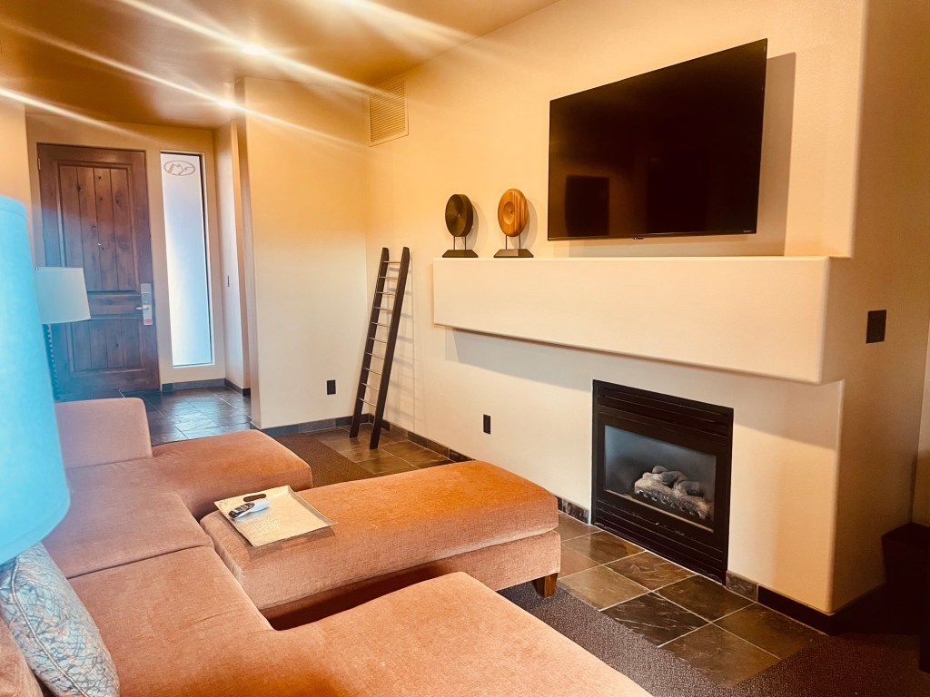 Walking back out into the hallway, a doorway opened up into a very generous living area. Another full sized bathroom could be accessed from here. The living room was equipped with a sectional sofa where you could lounge and enjoy another fireplace and TV. A dining table and kitchen were also in here (including a stove!). You could easily cook meals here, if you were so inclined, but there was no need to do so because the Canyon Breeze Restaurant at the resort made sure you were always well fed. Once again, access to the outdoors was given through another sliding patio door from the living area.