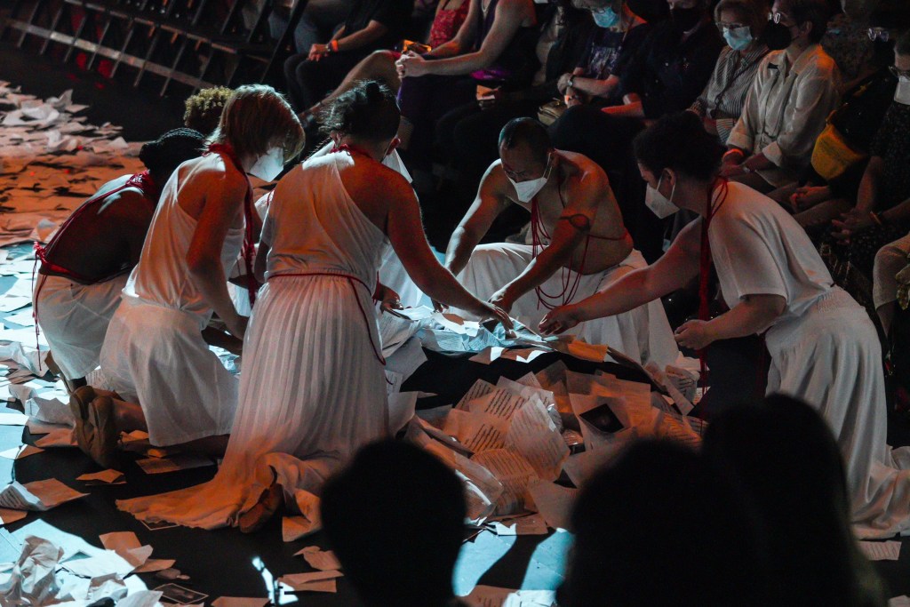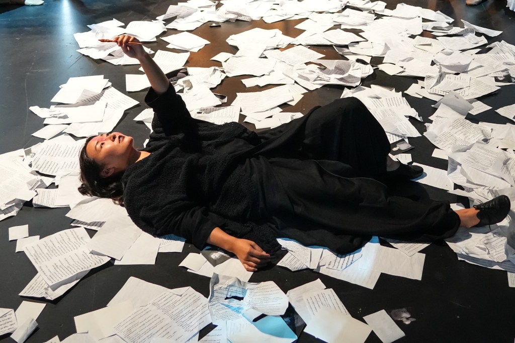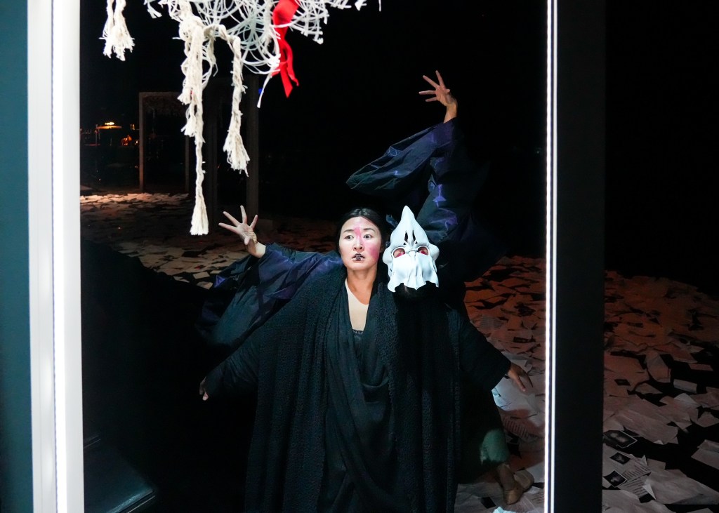 The pre-show instructions informed us that, “Before taking your seat on the stage of the Miller Theater for The Raven, journey through Poe’s verse as you travel through the theater with a performer as your guide. A collaboration between director Aria Umezawa and the Philadelphia-based Obvious Agency, this interactive discovery of grief, love, and the afterlife will transform how you encounter Hosokawa’s music.”