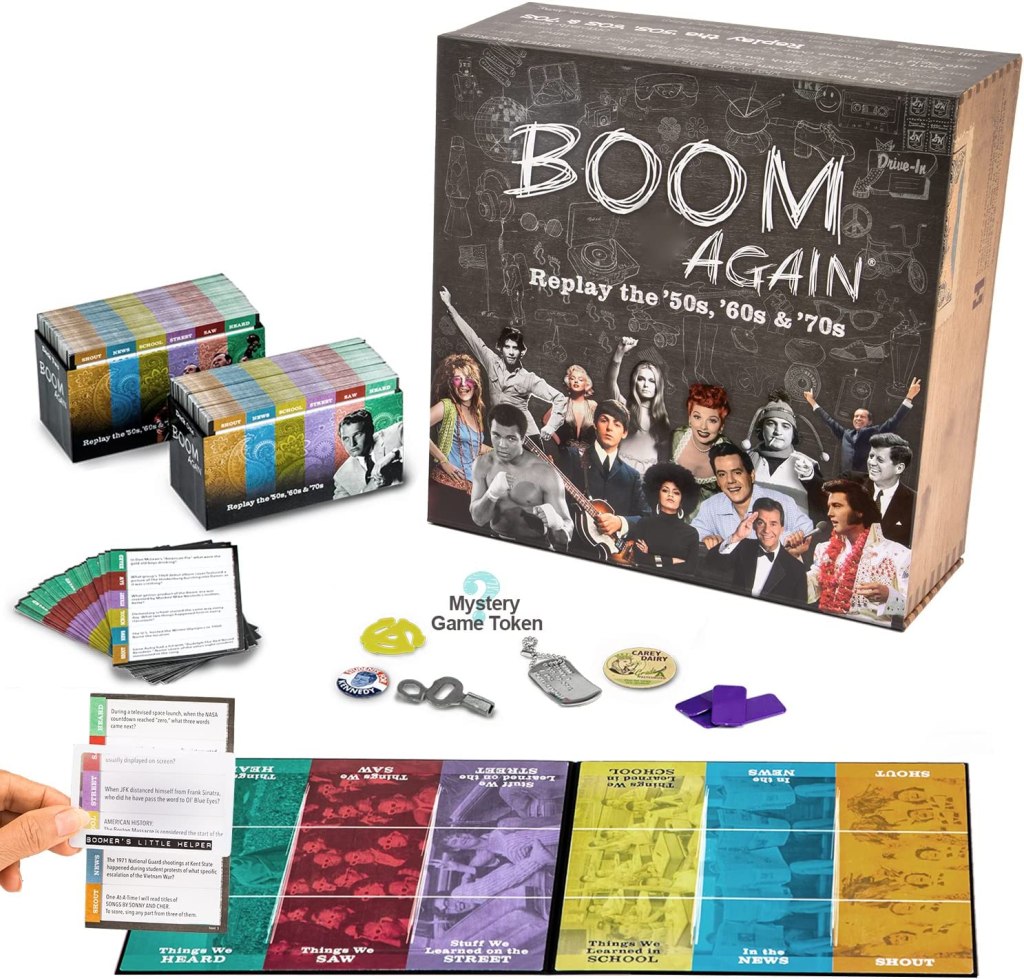 For those that grew up in the 1950s-1970’s, Boom Again is a must-have. This “cultural trivia” board game from the creator of Taboo, Outburst, and Super Scattergories, will take Baby Boomers back to warm, fun memories of growing up—and breaks the mold of conventional trivia games. The game speaks directly to the generation that grew up in that time period. Designed to be played by two players—or two teams, Boom Again features over 2,200 questions drawing from advertising slogans and jingles, politics and social movements, movies, music, and television. It’s packaged in a “cigar box” — just like the ones where Boomers kept their prized possessions. Authentic touchstones become the game tokens, including a real metal skate key, the center insert adapter from a 45 rpm record, a “Students For Kennedy” campaign button, a Vietnam-Era dog tag, and a working roach clip. The game even includes a “Boomer’s Little Helper” magnifier, just in case players forget their readers.