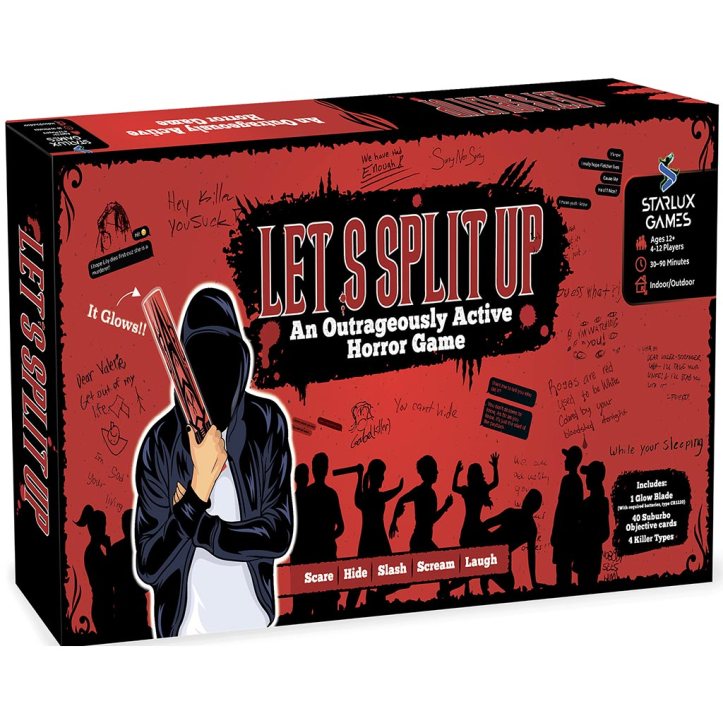 Want to play some games that get your family moving? Check out these fun options from Starlux games. Wizards & Werewolves is a super fun way to get kids (and adults) playing together. Make it a neighborhood activity when the sun goes down. Up to 10 players can play! So much fun! Feel like battling it out? Pick up a game of GlowBattle. You can turn off the lights and let up to 4 plays battle it out as ninjas with foam swords. Play it indoors or out, just let them burn lots of energy while they play! New to the Starlux games line up is a fantastic game, great for kids 12 and up, called Let’s Split Up. This parody on Horror movies is hysterical and is a great way to pass the time with family and friends. It’ so much fun!