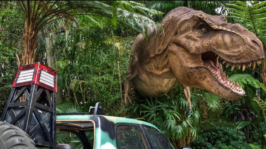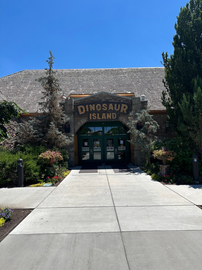 Nearing the end of the tour is the waterfall and amphitheater area were they have interactive fossils digging, and a cute photo-op of a Gigantosaurus chasing after one of the golf carts. This is another good area to break and get food or a drink at the concession building. After this there were a few more dinosaurs on our walk over the waterfall and also a gift shop with fun dinosaur themed keepsakes. We truly enjoyed our day out at Dinosaur Island. Such a good day to be outside in the beautiful Ashton Gardens, learn new things, and get to experience life-sized dinosaurs that were the best I have seen!
