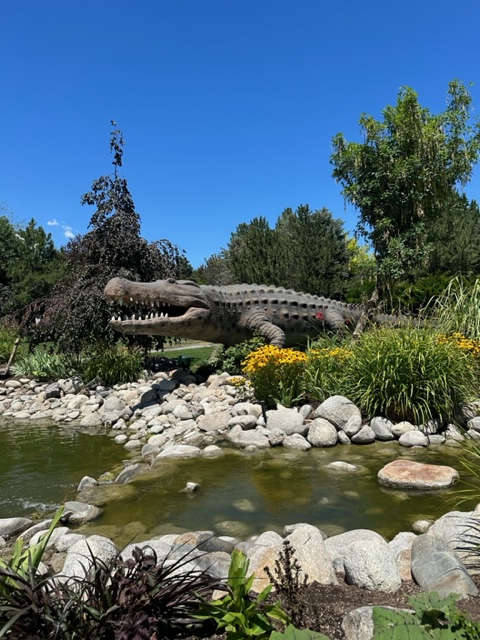 One of the exhibits showed a cage with broken fencing where the Utah Raptors had apparently “escaped” so the rest of the time we were on were on the lookout for the freely roaming raptors, who we heard were very photogenic. Every dinosaur that you would find throughout the gardens had a name chart and facts to learn all about that specific dinosaur. It was cool to learn all about whether they were herbivores or carnivores, what time period they lived in, and how big there were. An amazing dinosaur to see is the Brachiosaurus. This dinosaur towers over the gardens at over 40 feet tall! One of our favorite stops was to see the Deinosuchis, which is a prehistoric crocodile that was 35 feet long! This dinosaur was right next to the water and it was the perfect spot to take a break and feed the koi fish we had purchased the food for earlier. It was a hot summer day but there are so many shady areas to rest and also water bottle refilling stations all thoughout the garden.