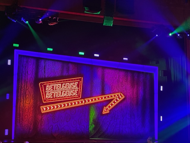 We found our seats and settled in for the show. Immediately, the vibe in the Eccles was electric. Neon colors, haunting music and a very Tim Burton-esque ambiance filled the theater. I was starting to get excited to see what was to come. Looking throughout those seated in the audience also added to the fun. There were people in black and white patterns, costumes, colored hair, and more. Much like Tim Burton’s Nightmare Before Christmas, Beetlejuice had a cult following and they were out in full force last night. It was really fun to see!