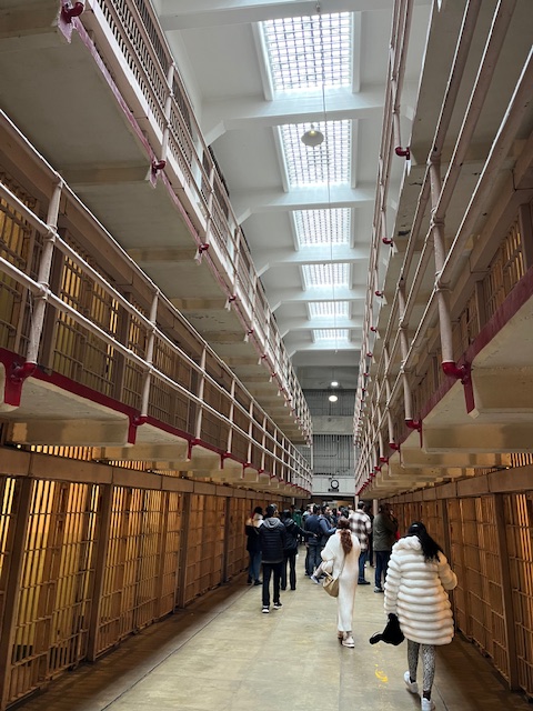 As we walked through the cellhouse, the barren walls with peeling paint helped to illuminate the history of the jail as we listened intently to previous staff and inmates explain what occurred in daily life at Alcatraz. We learned the rigidness of the schedule, the lack of privacy, the invasive inspections each prisoner endured at their arrival, and even about the few escape attempts that happened (although one was successful!). We got an inside look at the cells of famous inmates like Al Capone and the Birdman, and one particularly memorable event for me was the ability to go inside a solitary confinement cell. I couldn’t stand being in the dark, claustrophobia inducing cell for a few minutes, let alone months at a time.