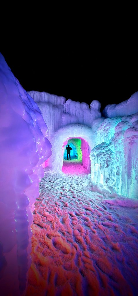 And then there are the lights—oh, the lights! As the sun dips behind the Rockies, the castles transform into a glowing masterpiece. Blues, purples, pinks, and greens ripple through the ice, making every corner a photo op and every moment a memory.