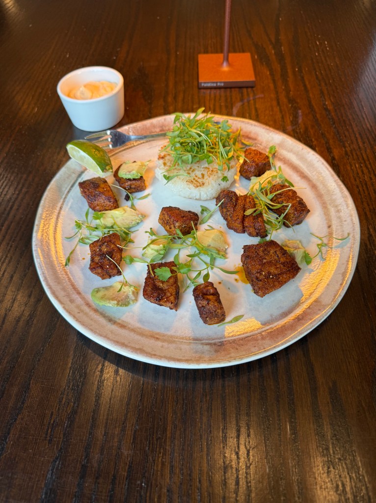 We ordered two appetizers, the first being blackened tuna bites, which came with a sushi rice cake, micro greens, avocado, and sriracha mayo. Having been disappointed by sriracha-heavy sauces many times, we first tried it without the sauce.