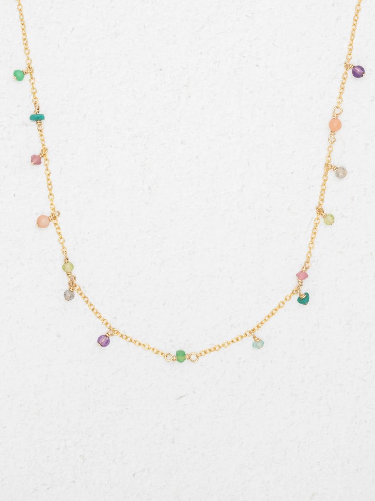 The Holly Yashi Aura Necklace features a delicate chain adorned with rainbow-hued gemstones. It’s a versatile piece that adds a pop of color to any outfit, perfect for moms who love unique jewelry.