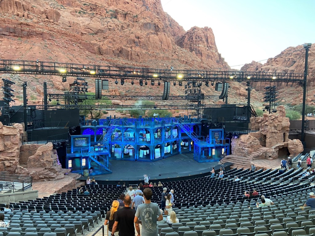 If you’ve never been, there’s something unforgettable about watching a show here. The red rock cliffs, the warm evening air (tonight was actually perfect, which is saying something for St. George in August), and the way the stage transforms with each backdrop—it all feels larger than life.
