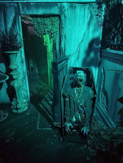 Before you even hit the haunted house itself, you go through the haunted courtyard — and honestly, it’s spooky enough to be its own attraction. The fog, the lighting, the sounds — it’s eerie, immersive, and perfectly unsettling. By the time you reach the main entrance, your nerves are already shot… and that’s exactly how they want you.