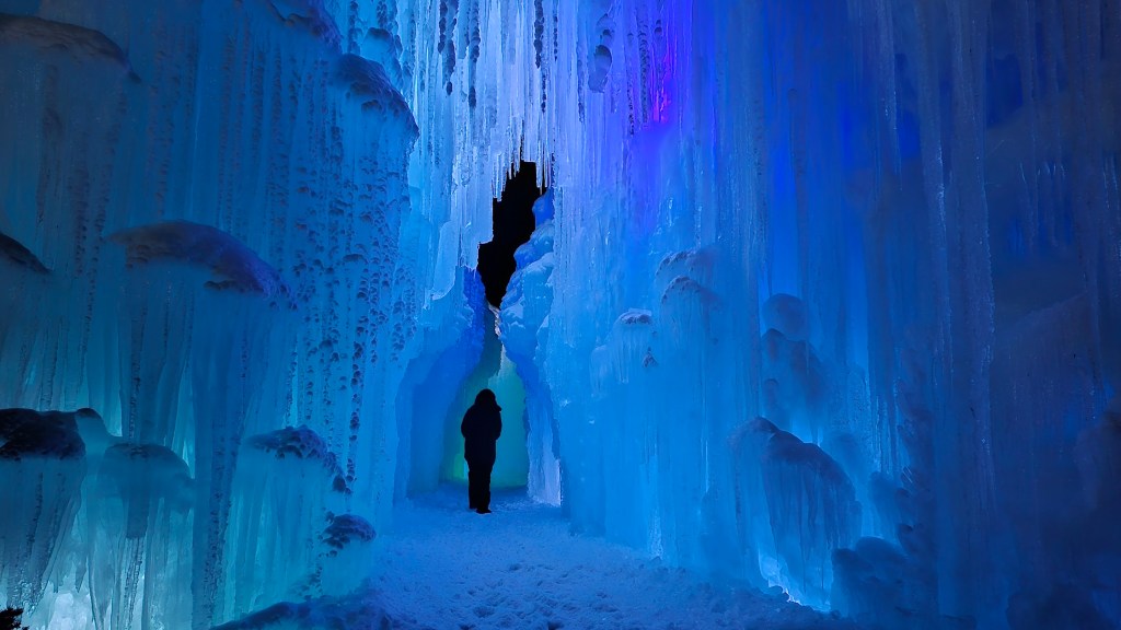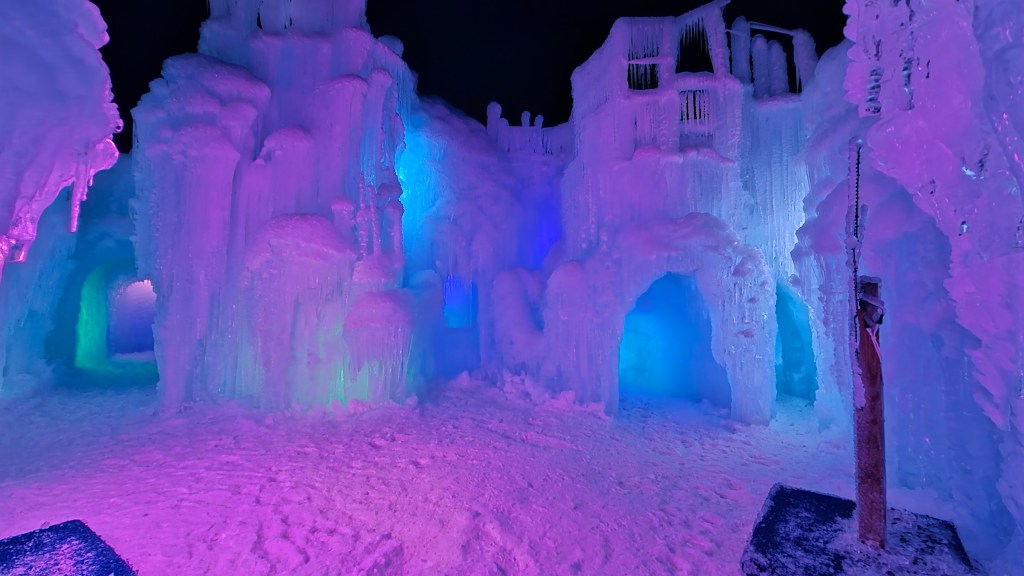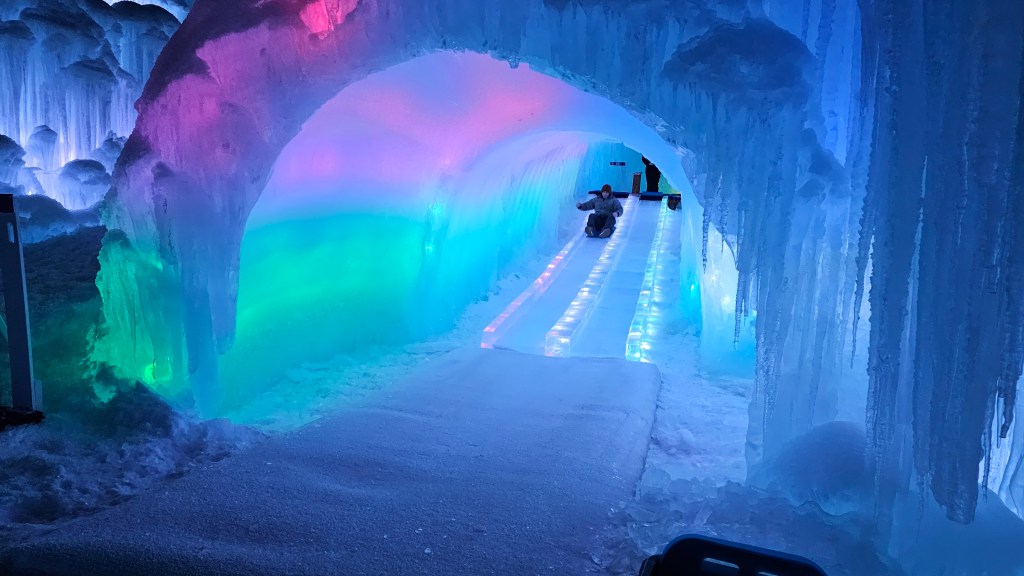 You wander through icy corridors that twist and turn, each one revealing something new. There are tunnels that feel like secret passageways, towering caverns that echo with laughter, and frozen slides that instantly become the highlight for kids — and let’s be honest, for grown-ups too. The ice isn’t just white and cold. It glows. Soft blues, purples, and pinks shimmer through the walls, making everything feel dreamlike, especially as the sun goes down and the lights really come alive.