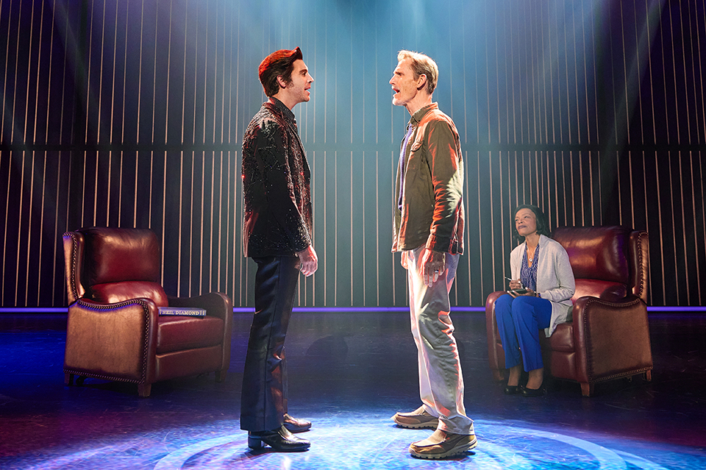 The show tells Neil Diamond’s life story in a way that instantly pulled me in. Instead of a straightforward timeline, it begins with an older Neil meeting with a therapist. Together, they dig through his memories, his lyrics, and the experiences that shaped him. This framing made the story feel personal and reflective, almost like being invited into his inner world rather than watching a highlight reel of fame.